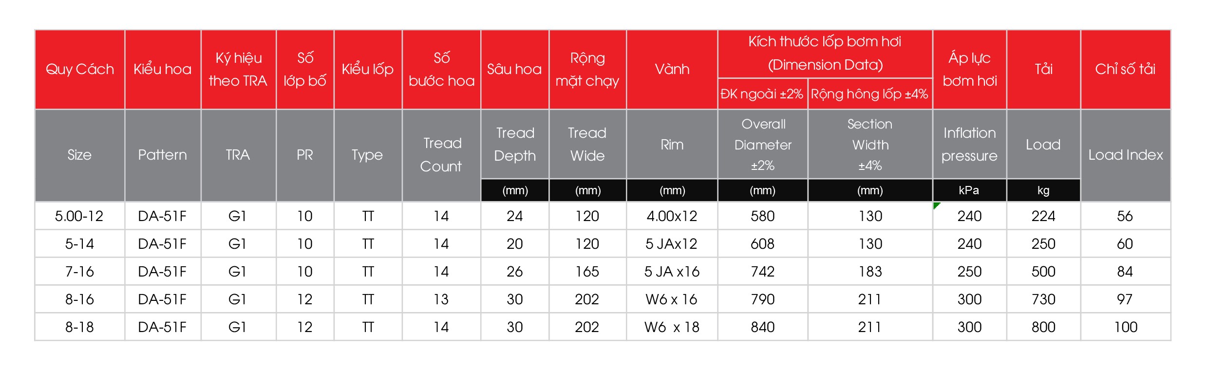 | QUY CÁCH | 5.00 - 12, 5 - 14, 7 - 16, 8 - 16, 8 - 18 |